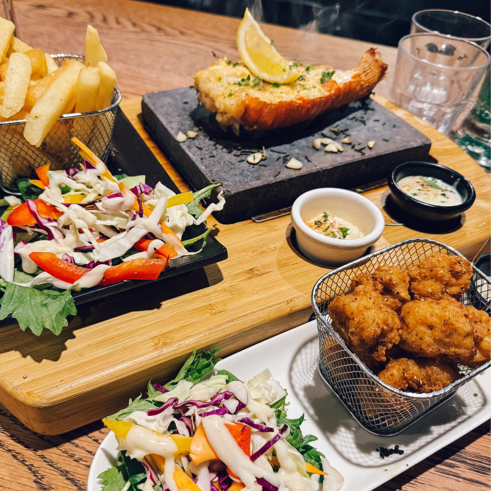 The original plan was to go to Nins Bin, but unfortunately, our arrival and departure times here didn’t line up with their hours. Instead, we went to Groper Garage, where we had a hot stone crayfish with chips, salad, lemon, and butter for only $55 NZD, and it was fabulous! Also got their salt-and-pepper squid and shared everything.