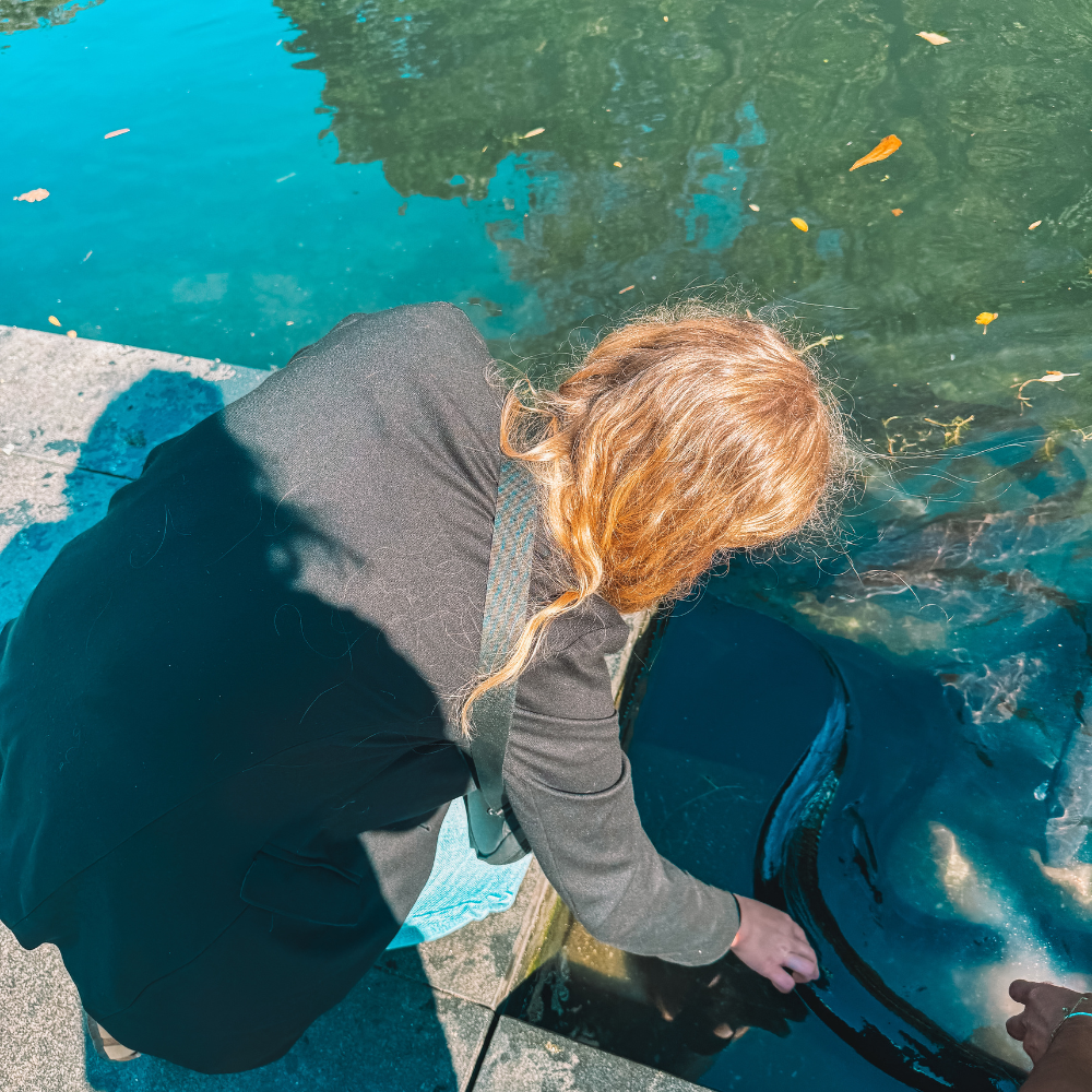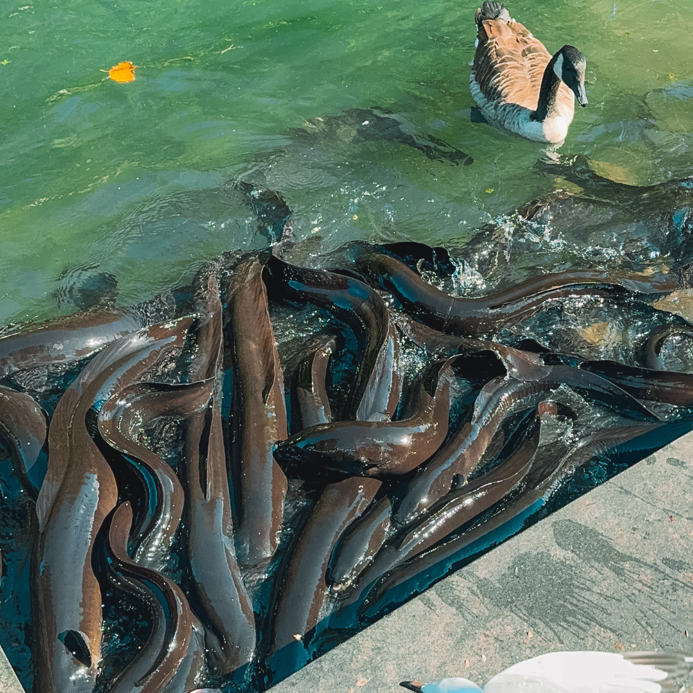 During my visit, a man came to feed them, causing them to gather in a swarm. I fed an eel a sausage and even got to touch one. Their teeth are in the back of their mouths, not the front, but also do this at your own risk. Their skin is slippery!